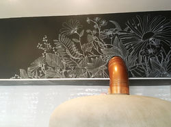 Über dem Pizzaofen findet man im Mercato eine riesige Blumenwiese, die aus der Wand wächst. Schwarz-weiße lineare Pflanzen bilden einen Kontrast zu dem kupfernen Ofenrohr und integrieren eine spätere Tafelgestaltung.